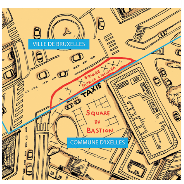 L’étrange tracé des frontières communales entre Bruxelles et Ixelles, dessin de Manu Scordia paru dans Ensemble ! Pour la Solidarité, contre l’exclusion, n°97, septembre 2018.