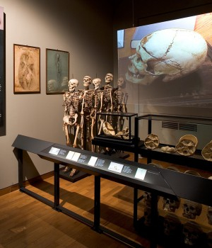 En premier lieu, la vie plus que centenaire du musée et les modifications intervenues dans l’organisation de ses espaces permettent d’interroger la relation entre aménagement et usages politiques des collections muséographiques. Il suffit de comparer les différentes techniques employées pour exposer les restes humains dans la seconde moitié du XIXe siècle et aujourd’hui : si on est invariablement confronté à une mise en scène, qui exploite les effets de lumière et la configuration architecturale des différentes salles, les photographies du début du XXe siècle renvoient à la valeur d’usage des tas de squelettes et des centaines de crânes placés sur des étagères [ill. 1, 2, 3], alors que la mise en contexte (vitrines, légendes, vidéos) et la séparation entre le visiteur et les objets du musée contemporain soulignent plutôt la valeur de témoignage historique de ces derniers [ill. 4, 5, 6, 7, 8].