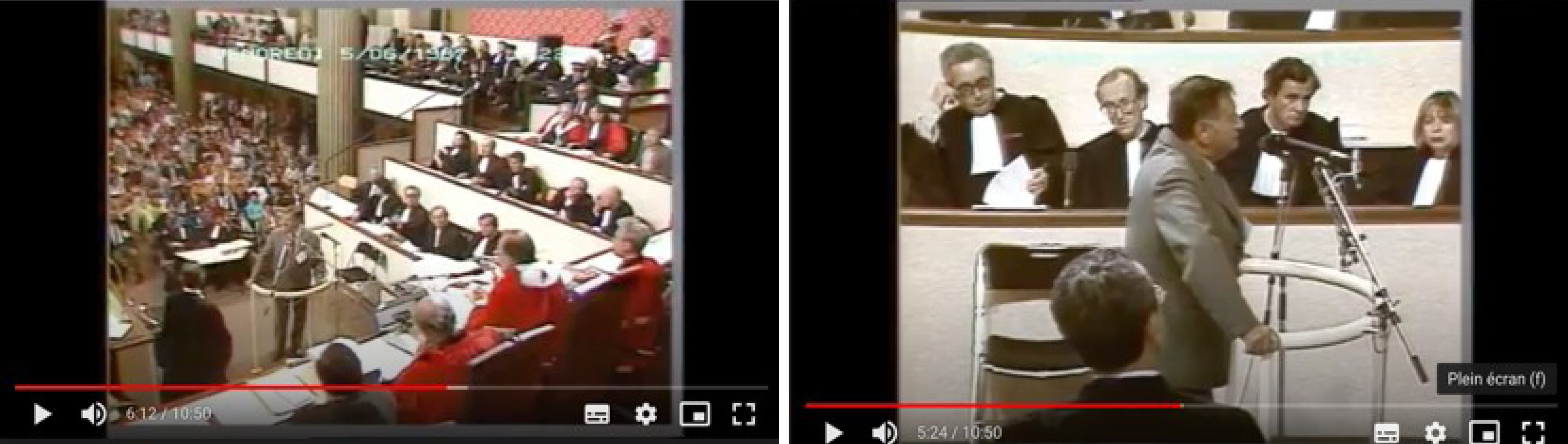 Dès le procès Barbie, la décision de « filmer pour l’histoire » l’intégralité des audiences, comme celle d’autoriser la diffusion de l’ouverture du procès en direct et en Eurovision dans les journaux télévisés, ont été soutenues par la volonté de faire œuvre de pédagogie face au développement des thèses négationnistes. Cet objectif s’est maintenu comme un fil rouge lors des procès suivants et fut confirmé en 2007 par le filmage du procès en diffamation qui opposa Robert Badinter à Robert Faurisson : il s’agissait de conserver dans les archives audiovisuelles de la justice la démonstration judiciaire44 de la condamnation du militant négationniste et de sa qualification de « faussaire de l’histoire ».