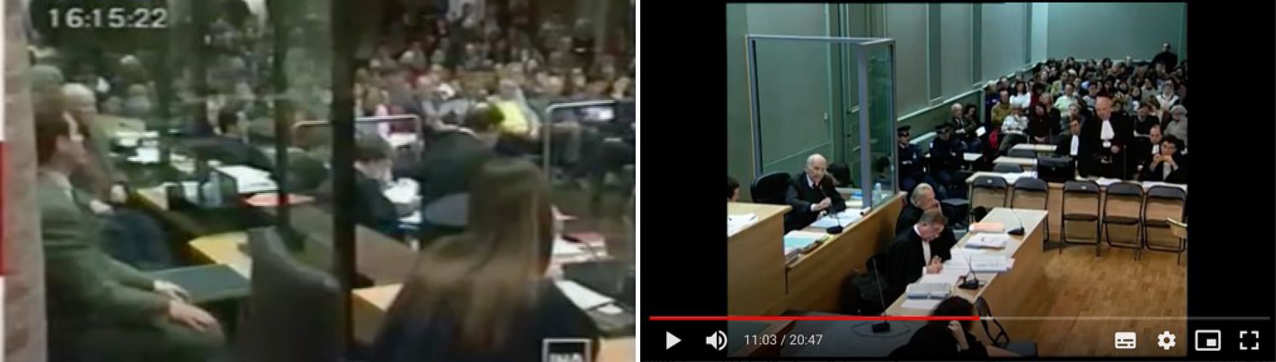 Malgré un cahier des charges contraignant et la présence d’un magistrat auprès du réalisateur, le visionnage aux Archives nationales des enregistrements des trois procès permet de mesurer les libertés que les réalisateurs prirent avec les consignes pour restituer la dynamique des audiences. Les captures d’écran qui suivent rendent visibles ces écarts vis-à-vis des normes du filmage définies par l’institution judiciaire et autorisent une mise en critique de leur rigidification dans les procès actuels pour actes de terrorisme.