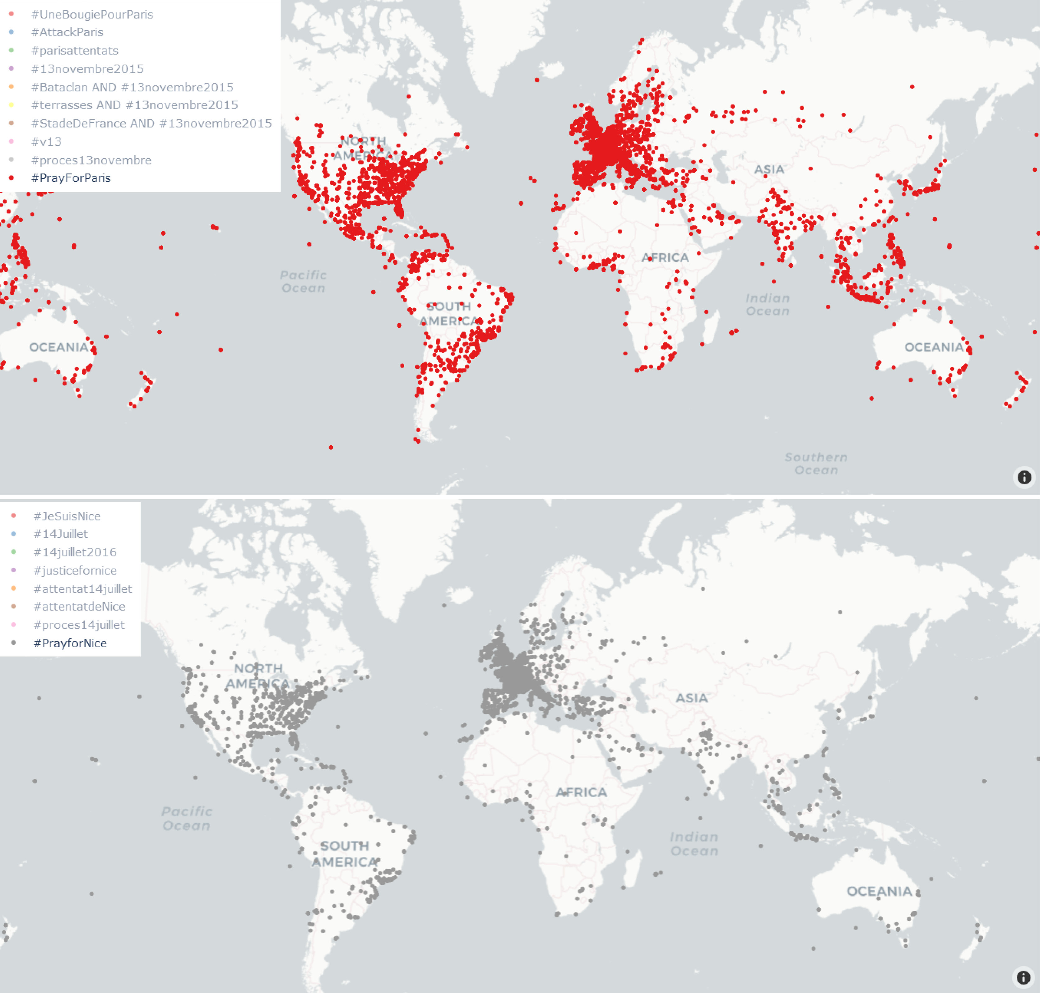 Figure 2. Origine des tweets géolocalisables. 1. #PrayforParis. 2. #PrayforNice.